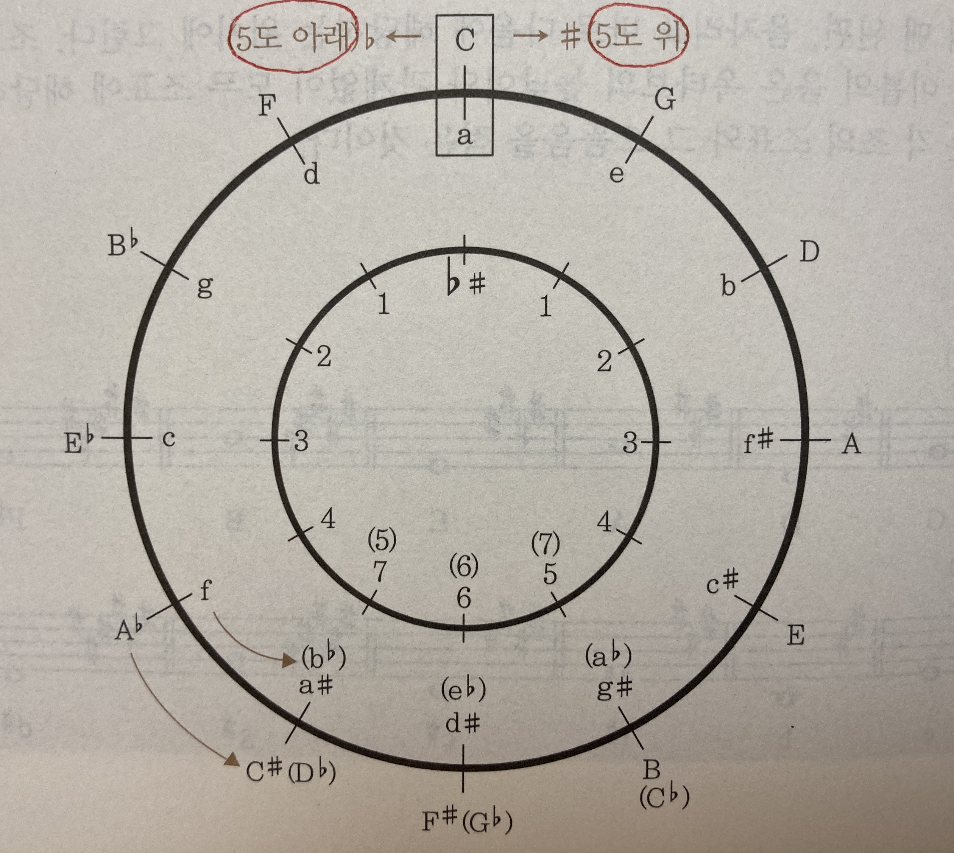 5도권이란 C를 중심으로 시계방향으로 완전 5도 상행, 반시계 방향으로 완전 5도 하행하는 진행을 말해요. 조에 관한 모든 관계를 도표로 나타낸 것으로 음계와 조표를 이해하는데 편리합니다. (그리고 전조 할 때는 5도권 내에서 하는 게 좋아요.)
