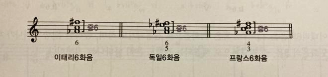 증6화음은 3화음이나 7화음의 전위형으로 되어 있으며, 여기에 변화음이 첨가되면서 맨 아래 음과 맨 위 음이 증6도를 이루어서 증6화음이라고 합니다. 이태리6화음, 프랑스6화음, 독일6화음이 있는데 많이 쓰이지는 않아요.