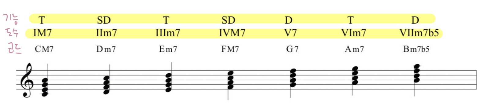 코드 진행을 이해하고자 할 때에는 ⓵ 그 곡(혹은 그 부분)이 무슨 조인지, ⓶ 그 코드는 그 조에서 어떤 역할을 하는지를 기능적으로 생각해야만 합니다. 메이저 스케일의 다이아토닉 코드는 Tonic, Sub-Dominant, Dominant의 3가지 기능을 가지고 있어요.
