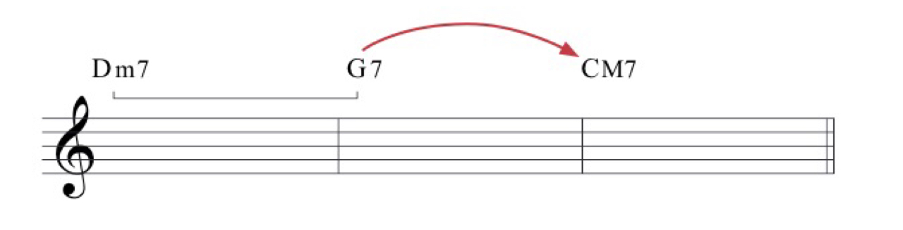 Ⅱ-Ⅴ-Ⅰ 진행은 재즈의 핵심으로, 스탠다드 재즈 곡 뿐만이 아니라 팝이나 가요에서도 매우 많이 사용되는 진행이에요. 이 진행에서 재즈 곡을 분석할 때에는 Ⅱ-Ⅴ 진행에 브라켓을 넣어주고 Ⅴ-Ⅰ에는 화살표를 넣어 줍니다.